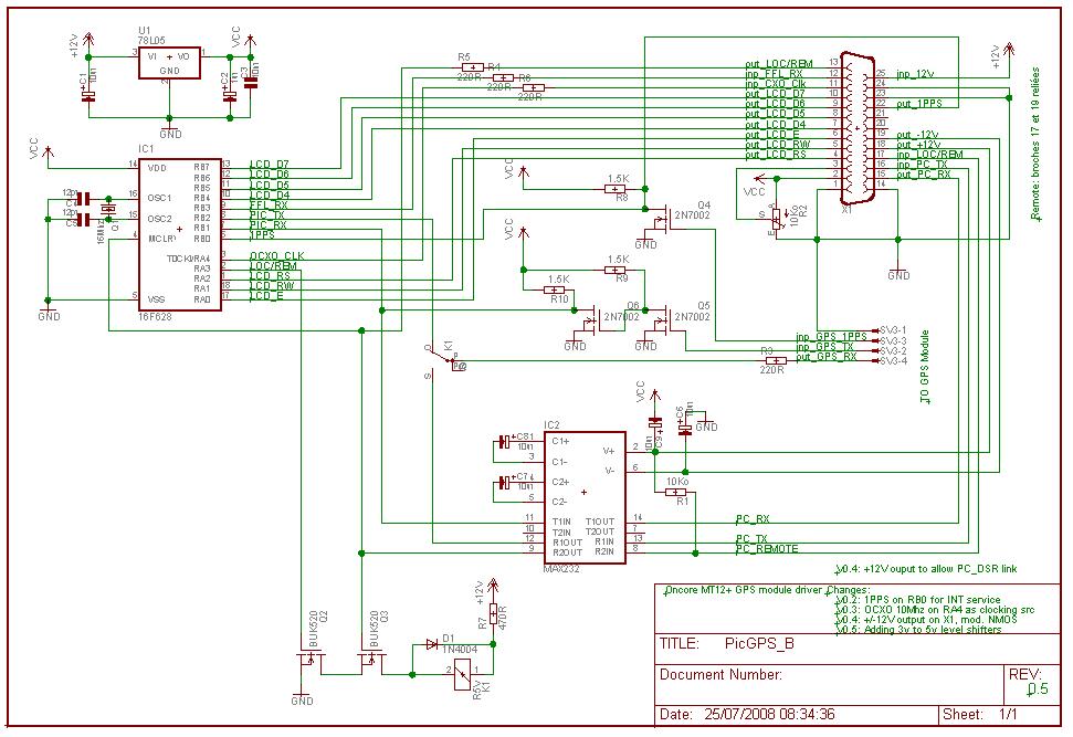 As I do not want to be dependent on my PC to display some useful information I decided to design a dedicated PIC control module. This module is able to display GPS information such as status, latitude, longitude, height, date and time to the first line of a 2x16 charecters LCD display and the VE2ZAZ OCXO control module status on the second line. It has been designed handle the Motorola Oncore MT12+ (timing) GPS module: initialization sequence and status message - the @@Hb sequence - decode.